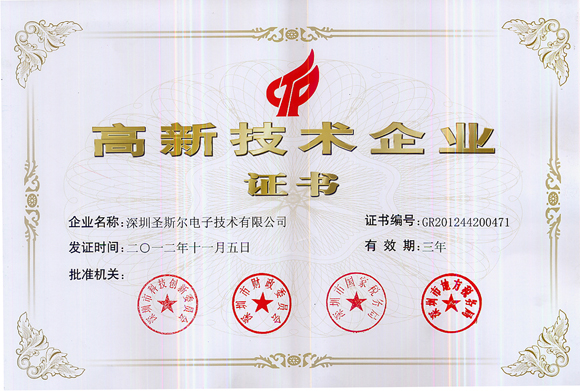 2012年12月15日,從深圳市科技工貿和信息化委員會獲悉:深圳圣斯爾電子技術有限公司經過國家科技部嚴格審核,正式被認定為"國家級高新技術企業",并取得《高新技術企業證書》(證書編號GR201244200471),發證時間為2012年11月5日,有效期三年。